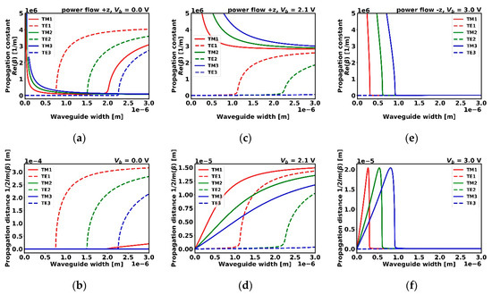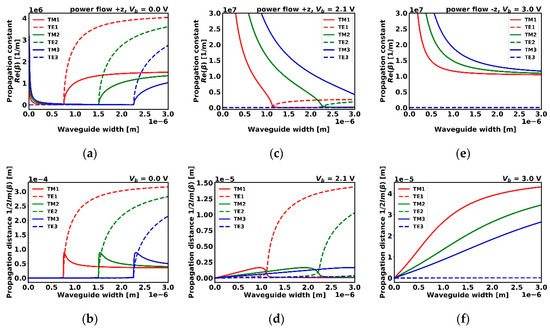 Beginning with the case where the guiding layer reveals positive elliptic dispersion (Vb = 0 V, ε∥ > ε⊥ > 0), we observe that TE and TM modes behave similarly as in a dielectric slab waveguide with metallic boundaries [49]. It is worth noting, that the modes of both types possess the same cut-off widths (see Figure 3a and compare Equations (6) and (8) for β = 0). Thus, for a given waveguide width, the number of propagating TE and TM modes is always equal. For each TM mode order, there exist an optimal waveguide width, which provides the longest propagation distance (see Figure 3b). Additionally, the propagation distance asymptotically approaches a finite value for arbitrarily increasing waveguide width. For TE modes, the propagation distance increases with the waveguide width and monotonically with the propagation constant. Moreover, for both types of modes, the power flow direction is parallel to the phase velocity direction, as found for classical waveguided modes.