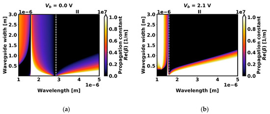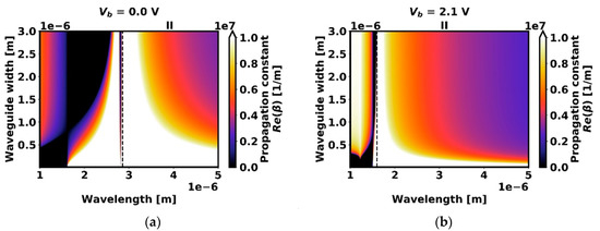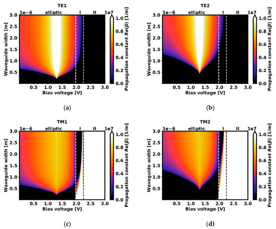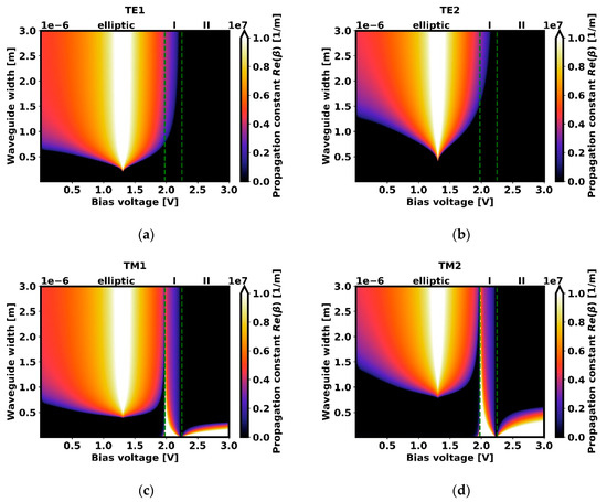 For broader insight into the waveguide propagation properties, “propagation maps” are presented, which illustrate the propagation constant as a function of the waveguide width and the biasing voltage, for TE and TM modes of the first and second order each (see Figure 4). The areas corresponding to dispersion regions of the guiding layer are indicated above the top bar of each plot (positive elliptic dispersion, abbreviated as elliptic; type I HMM, I; and type II HMM, II). At this time, we are still considering propagation properties at a fixed wavelength of 1.55 µm. Black areas indicate regions of no propagation, i.e., approximately where the imaginary part of β is greater than its real part.