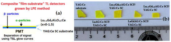 The possibility of the creation of such types of composite TL detectors for the simultaneous registration of α- and β-particle excitation was shown firstly by us in [17]. This work is a continuation of the research in this direction and dedicated to the development of new types of composite TL detectors for the simultaneous registration of the different components of mixed ionization fluxes based on the SCFs of Ce3+-doped Lu3−xGdxAl5O12:Ce (x = 0–1.5) garnet and Y3Al5O12:Ce (YAG:Ce) SC substrates using the LPE growth method.