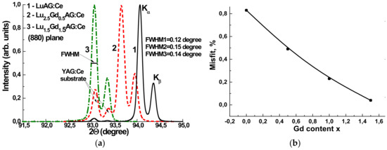 XRD measurements were used for the characterization of the structural quality of Lu3−xGdx Al5O12:Ce SCF samples with different Gd content and determination of the SCF lattice constants and SCF/substrate misfit m (Figure 2).
