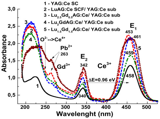 The absorption spectra of Lu3−xGdxAl5O12:Ce SCF/YAG:Ce SC epitaxial structures in comparison with the absorption spectrum of the YAG:Ce substrate are shown in Figure 3. It is worth noting that the absorption spectra of the epitaxial structures represent the mixes of the spectra of the YAG:Ce substrate and the respective SCF sample with a total thickness in the 32–100 μm range (see Table 1).