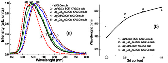 CL spectra (a) of LuAG:Ce, Lu2.5Gd0.5AG:Ce, LuGdAG:Ce, Lu1.5Gd1.5AG:Ce SCFs in comparison with YAG:Ce substrate and (b) shift of emission band.