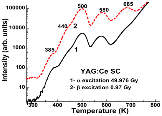 Glow curves of YAG:Ce SC after irradiation by α- (1) and β- (2) particles, respectively.