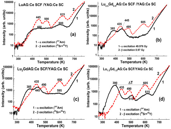 In the first stage, we analyzed the thermoluminescent curves for substrate. Figure 5 shows the similar TSL properties under excitation by α- and β-particles, but the integral intensity of the TSL peaks is strongly determined by the absorbed dose of radiation (curves 1 and 2, respectively). The TSL glow curves of Lu3−xGdxAl5O12:Ce SCFs/YAG:Ce SC epitaxial structures with different Gd content x under excitation by α- and β-particles from 241Am and 90Sr + 90Y sources, respectively, are shown in Figure 6.