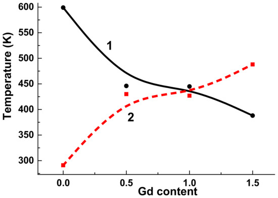 As can be seen from Figure 6a, after α-particle irradiation, the main peak of the LuAG:Ce SCF/YAG:Ce SC structure was observed at 600 K. This result is consistent with the results of our previous work [17]. In accordance with the results of the work in [18], increasing the Gd content in the Lu3−xGdx Al5O12:Ce SCFs led to the shift of position of the main TSL peaks to the low temperature range, to 390 K in the Lu1.5Gd1.5Al5O12:Ce SCF sample (Table 2 and Figure 6d). Meanwhile, the position of the main TL peaks in the Lu3−xGdxAl5O12:Ce SCF/YAG:Ce SC structure after β-particle irradiation did not change notably (Table 1) due to the fact that the β-particles a were mainly absorbed by the YAG:Ce substrate. Therefore, the difference ΔT between the main TL peaks of SCF and substrate parts of a composite detector, corresponding to the registration of α- and β-particles, increased steeply with an increasing Gd content x in the Lu3−xGdxAl5O12:Ce SCFs. Namely, ΔT value is equal of 215 degrees for Lu1.5Gd1.5Al5O12:Ce SCFs (Figure 6d and Figure 7, curve 2).