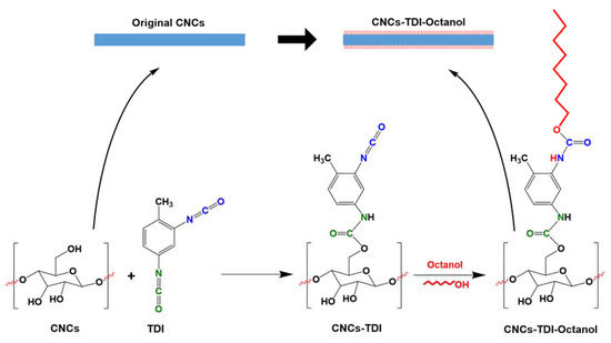 Most of the commonly used polymers such as polyolefins are hydrophobic, while CNCs are hydrophilic. Two main approaches have been used to overcome this issue. One approach relies on the use of compatibilizers or coupling agents such as maleic anhydride-grafted-polyethylene (MAPE) for nanocellulose/polyethylene composites [14,15]. The other approach reduces the hydrophilicity of CNCs by reacting the surface hydroxyls with a variety of hydrophobic chemicals through relatively simple reactions such as acetylation and carbanilation or through grafting bulkier chemicals and polymers [16,17,18]. In a previous report by the authors, the surface properties of CNCs were tailored by grafting alcohols of different chain lengths onto their whole surface (almost all available surface hydroxyls, i.e., a degree of surface modification of ca. 100%) using 2,4-toluene diisocyanate (TDI) as a linker (Figure 1) [19]. Four alcohols were explored: ethanol, 1-butanol, 1-hexanol, and 1-octanol. As a result of this surface modification, CNCs with a tailored water contact angle of up to 120° were prepared, which was a result of growing a hydrophobic shell around the CNCs. These modified CNCs were used to reinforce poly(butylene succinate) (PBS), a hydrophobic polymer. The resultant composite showed improved interfacial adhesion, which was dependent on the alcohol chain length as confirmed by microscopic and thermomechanical investigations. This approach was proved to be simple for tailoring the surface properties of CNCs by only varying the alcohol chain length. It is also expected to improve the interfacial adhesion between CNCs and other hydrophobic matrices.