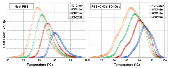 The crystallization exotherms of neat and reinforced poly(butylene succinate) (PBS (left)) (PBS+CNCs-TDI-Oct (right)) at different cooling rates (4, 6, 8, and 10 °C/min).