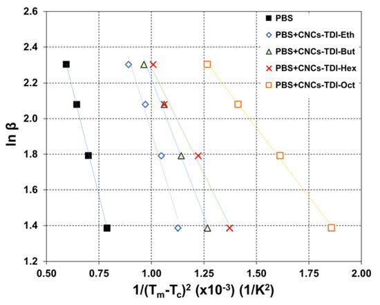 when applied on the crystallization of neat and CNC-reinforced PBS, straight lines were obtained (Figure 3), and the slope was either the B value for the neat PBS or the B* value for the reinforced PBS. Then, the nucleation activity factor was calculated (Table 2). According to the results, it is clear that PBS nucleation was accelerated in the presence of CNCs in general, as the B* values of the reinforced PBS were all lower than the B value of neat PBS. Moreover, the nucleation activity was dependent on the surface properties of the CNCs as it increased with increasing the chain length of the grafted alcohol. This implies that stronger PBS/CNCs interfacial adhesion results in stronger nucleation activity, as suggested earlier in Table 1.