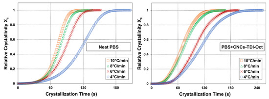 Plots of relative crystallinity with time at different cooling rates for neat PBS (left) and PBS+CNCs-TDI-Oct (right).