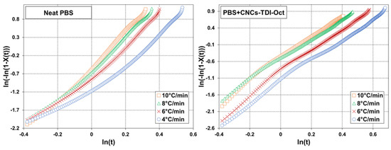 Avrami curves describing the crystallization of neat PBS (left) and PBS+CNCs-TDI-Oct (right) at different cooling rates.