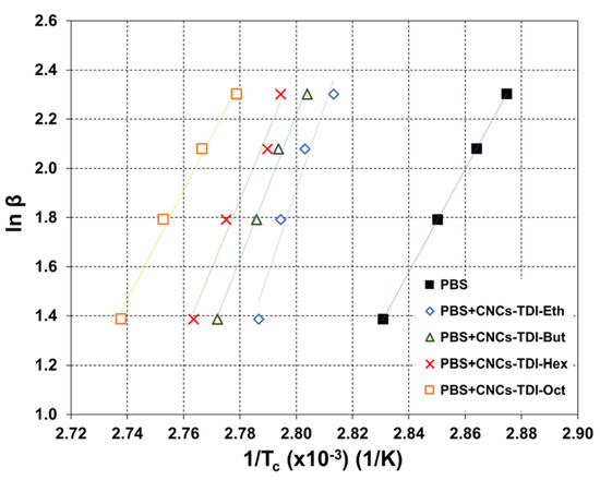 The estimated crystallization activation energy of neat PBS was 169 ± 5 kJ/mol (Figure 6). This value is in accordance with the values reported in the literature [36]. It increased to 266 ± 16 kJ/mol when PBS was reinforced by CNCs-TDI-Eth. This implies that crystallization was hindered, although the addition of the modified CNCs in general facilitated PBS nucleation. However, the activation energy was dependent on the surface properties of the CNCs. It decreased with increasing the chain length of the grafted alcohol. The activation energy was 236 ± 8, 225 ± 5, and 196 ± 11 kJ/mol using CNCs-TDI-But, CNCs-TDI-Hex, and CNCs-TDI-Oct, respectively. These conclusions agree with those made based on the estimated Avrami kinetics parameters (Table 2).