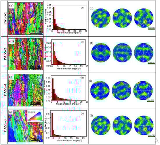 Electron back-scattered diffraction (EBSD), grain boundary evolution, and pole diagrams of Cu1.5Cr0.1Si alloy after C-path of ECAP deformation and aging at 350 °C for 4 h.Electron back-scattered diffraction (EBSD) after (a) 1 pass (d) 2 passes (g) 4 passes (j) 8 passes; grain boundary evolution after (b) 1 pass (e) 2 passes (h) 4 passes (k) 8 passes; pole diagrams after (c) 1pass (f) 2 passes (i) 4 passes (l) 8 passes.