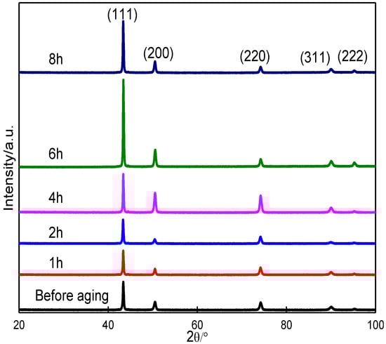 XRD patterns of the Cu1.5Cr0.1Si alloy after eight passes of C-path extrusion and different aging at 350 °C are shown in Figure 2. It can be seen from the figure that the main diffraction peak of the alloy before aging is the (111) crystal plane, and that the main diffraction peak remains the (111) crystal plane after aging. The relative intensity of the (111) and (200) crystal plane diffraction peaks increased continuously before aging for 6h, and the intensity of the (111) crystal plane diffraction peaks decreased relatively after 8 h, while the width of the diffraction peaks increased throughout the aging treatment. The analysis suggests that the precipitation of a large number of strengthening phases near the (111) crystal plane during the aging process, and the superposition of the precipitate phase peak and the matrix peak, resulted in a significant increase in the diffraction peak intensity [24]. The decrease after 8 h occurred because the number of precipitated phases gradually decreased, as the material was in an over-aged state. The increase in diffraction peak width was due to grain fibrosis and the precipitation of nano-scale precipitated phases after deformation and aging. It was found in the XRD phase search that the precipitated phases were mainly CrxSi strengthened phases and the chromium phase, mainly because the Cr element and Cu were difficult to dissolve. In addition, there was no significant change in the other diffraction peaks except the main diffraction peak, which indicates that the crystal slip was suppressed and the cross slip phenomenon was significantly reduced.