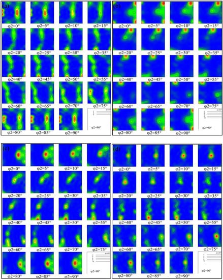 As shown in the orientation distribution function (ODF), after one pass of deformation and aging treatment, the strongest orientation was concentrated in the (110) crystal plane and the extreme density reached 4.66. After two passes, GBs tended to be homogenized, without obvious strong orientation, and the extreme density reached 7.12. After four passes, the preferred orientation of the crystals was again concentrated in the (110) crystal plane. After eight passes, the preferred orientation deflected clockwise by 60°, still concentrated in the (110) crystal plane, with an extreme density of 7.80, which is different from the results of previous studies on single crystal Cu [23]. At the same time, the preferential orientation was mostly segregated in the (110) crystal plane, and previous research on single crystal Cu also found that the strong orientation is easily segregated in the (110) crystal plane family, which may be a result of the grains broken and oriented along the pressure axis under the action of the applied stress, resulting in the orientation concentrated along the sliding direction.