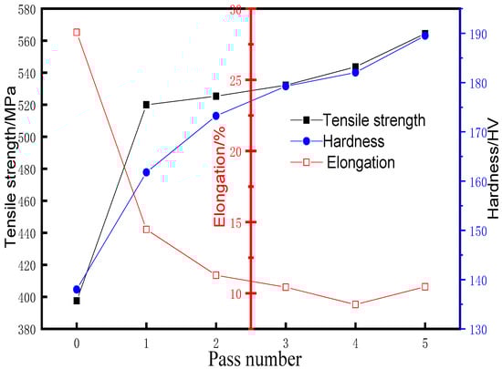 Figure 4 shows the hardness, tensile strength, and elongation of the Cu1.5Cr0.1Si alloy after five passes of ECAP deformation by route C. As can be seen, the original hardness of the Cu1.5Cr0.1Si alloy was 138.00 HV, which increased to 188.52 HV after five passes of deformation, and the increase range reached 36.60%. The tensile strength of the alloy before deformation was 397.50 MPa, and its change trend was consistent with the hardness curve. The strength, however, increased sharply after one pass of deformation, from 397.50 MPa to 520.00 MPa, an increase of 30.82%, and to a maximum of 573.54 MPa after five passes of deformation. It can be seen from the elongation curve that the elongation before deformation was 28.30%, and that the elongation decreased the most after one pass of deformation to 14.49%; after five passes it decreased to 10.46%. The analysis shows that the increase in strength and hardness was mainly due to the strengthening of grain refinement, the increase of broken small-angle grain boundaries, and the increase of dislocation density during the ECAP deformation process, as well as the precipitation of some strengthened phases due to the temperature rise effect under high strain. Precipitation strengthening occurred, increasing the strength and hardness of the material. Therefore, the strength and hardness still increased after five passes of deformation. The decrease in elongation was mainly due to the increase in dislocation density during deformation, which made slippage difficult and caused plasticity to decrease.