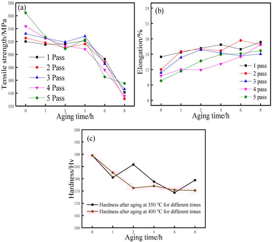 As shown in the hardness curve in Figure 5c, during the aging process at 350 °C, the hardness shows a downward trend, but a significant increase occurred after 1 h. This was due to the large number of dislocations annihilating and disappearing after aging at 350 °C. The strengthening effect caused by deformation was largely eliminated, and in the early stage of aging the number of precipitated phases was not enough to strengthen the material; as a result, the hardness of the material was reduced [25]. With the increase of aging time, the precipitation phase increased and pinned with dislocations, which greatly increased the shear stress required for a dislocation slip, slowing down the dislocation annihilation speed and at the same time hindering dislocation movement along the sliding surface; therefore, the hardness of the material was increased. The gradual growth of the precipitated phase destroyed the coherent relationship within the matrix, which caused the alloy to soften and reduce the hardness, so the hardness curve at 350 °C dynamically fluctuated. During the aging process at 400 °C, the hardness of the material continuously decreased, with the largest decrease in hardness occurring at 0–2 h and then gradually flattening. This is because the work hardening effect of ECAP was gradually eliminated after aging at 400 °C for 2 h, and the hardness of the material was reduced. However, due to the higher aging temperature, the number of precipitated phases was greater, and the hardness of the material increased. The combined effect of the two resulted in the material. The hardness value remained dynamic and stable.