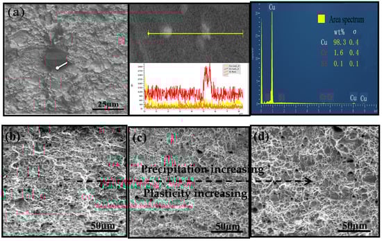 Figure 6 shows the fracture map of the Cu1.5Cr0.1Si alloy after five passes ECAP deformation by route C and aging at 350 °C. It can be seen from the energy spectrum of the fracture in Figure 6a that there is a precipitated phase at the fracture. The precipitated phase is mainly Cr and a small amount of Si element. This is mainly because the Si element is a trace amount of Cu-1.5Wt% Cr-0.1Wt% Si. The precipitation degree of alloying elements was relatively limited. As the aging time increased, the precipitation phase also increased, and it was dispersed in the alloy as a reinforcing phase. From the microscopic fracture morphology in Figure 6, it is observed that the fracture morphology was a typical microporous aggregate, which was composed of the dimple zone and the tear zone. The fracture was distributed, with a large number of dimples and tear edges of different sizes. As shown in Figure 6b, the morphology of the large dimple surrounding the small dimple appeared at the fracture after 4 h of aging, and this morphology depended on the order of the nucleus and the expansion of the dimple. In addition, there were more obvious dimple veins at the fracture, which were formed by parts of the dimples growing. After 8 h of aging, the dimples tended to be small and uniform, mainly presenting as shallow isometric dimples. It can be seen from the fracture map that the fracture mode of the material was obviously ductile fracture. The aging treatment eliminated the work-hardening phenomenon caused by the high strain after ECAP deformation, and the ductility of the material also increased. It can be seen that the aging treatment could help improve the Cu1.5Cr0.1Si alloy’s plastic toughness.