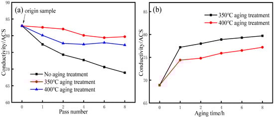 Figure 7a,b shows the conductivity and, respectively, relationship diagrams of the Cu1.5Cr0.1Si alloy after C-path ECAP deformation and aging treatment. As can be seen in Figure 7a, as the amount of deformation increased, the electrical conductivity of the material showed a downward trend; however, the electrical conductivity after aging treatment is always higher than that of unaged. The reason for this is that during the aging process, a large number of vacancies and interstitial atoms generated by plastic deformation would disappear, thereby reducing the degree of crystal lattice distortion, further reducing the scattering of moving electrons, and increasing the conductivity of the material. The increase in electrical conductivity was also due to the reduction in dislocation strain energy. Comparing the change in conductivity at two temperatures, it can be clearly seen that 350 °C was the best aging temperature for the Cu1.5Cr0.1Si alloy to improve conductivity. Figure 7b shows that after aging at 350 °C and 400 °C, the conductivity continuously increased, especially after aging for 0–1 h, the maximum increase in conductivity; during the aging for 1–8 h, the increase tended to be gentle. The conductivity of the material after aging at 350 °C was always higher than at 400 °C. The analysis indicated that this was because the conductivity of the alloy was greatly affected by the amount of solid-solution alloy elements in the matrix. The material underwent eight ECAP deformations before aging, and the conductivity was reduced to 68.9% IACS. During the aging process, the solid-solution atoms continue to precipitate due to the supersaturation of alloying elements at the initial stage of aging and the rapid precipitation rate. The maximum increase in electrical conductivity occurred during the initial stage of aging. After 1 h of aging, the precipitation rate of solid solution atoms gradually slowed down, and, at the same time the strengthening phase that precipitated earlier began to aggregate, which resulted in a decrease to the increase in conductivity. During the aging process, the orientation of the texture occurred, forming a stable {hkl} <110> texture, which reduced the degree of electron scattering and increase the conductivity of the material, consistent with the evolution of the texture.