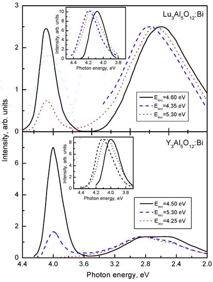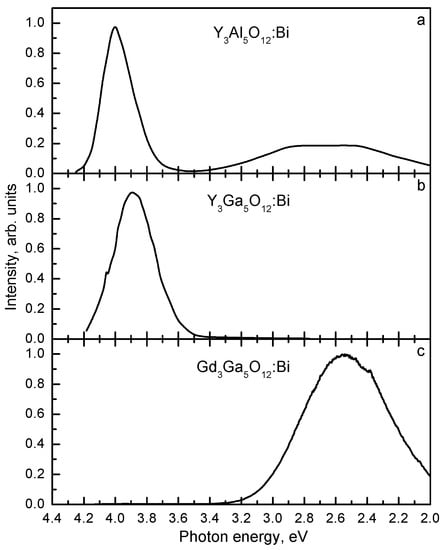 Characteristics of the lower-energy luminescence (the VIS emission) in various Bi3+-doped materials are similar and presented in Table 2. Let us demonstrate them at an example of the Lu3Al5O12:Bi and Y3Al5O12:Bi single crystalline films investigated in [16,17,18].