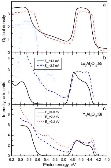 (a) Absorption spectra of Lu3Al5O12:Bi (solid line) and Y3Al5O12:Bi (dashed line) at 295 K. Excitation spectra (normalized) of (b) Lu3Al5O12:Bi and (c) Y3Al5O12:Bi measured at 80 K for different emission spectra regions shown in the legends. Based on the data reported in [16,17,18], presented with the publisher’s permission.