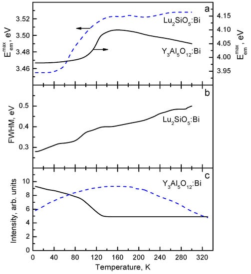 (a) Temperature dependences of the UV emission band maximum position in Y3Al5O12:Bi (solid line) and Lu2SiO5:Bi (dashed line), (b) the FWHM of the UV emission band in Lu2SiO5:Bi, and (c) the maximum intensities of the UV (4.0 eV, solid line) and VIS (2.5 eV, dashed line) emissions in Y3Al5O12:Bi reported in [17,18,21], presented with the publisher’s permission.