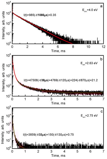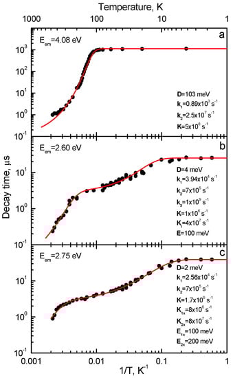 Temperature dependences of decay times measured for (a) the UV emission, (b) the 2.6 eV emission and (c) the 2.75 eV emission of Lu3Al5O12:Bi. The circles are experimental data. Solid lines are the best fits of the two or three excited-state level models (Figure 6 and Figure 10) to the experimental data (for details see the text). The parameters of the fits are reported in the figures. (a) Eexc = 4.6 eV, Eem = 4.1 eV; (b) Eexc = 4.7 eV, Eem = 2.4 eV; (c) Eexc = 5.3 eV, Eem = 3.2 eV. See also [16,17,18]. Presented with the publisher’s permission.