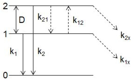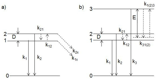 In case of the two-excited-level model (Figure 10a), the time evolution of the populations N1, N2 of the excited levels 1 and 2, respectively, can be described by the rate equations given by Equation (1) with consideration of Equations (2) and (3). In case of the three-excited-level model (Figure 10b), the time evolution of the populations N1, N2, N3 of the excited levels 1,2 and 3, respectively, can be described by the following rate equations: