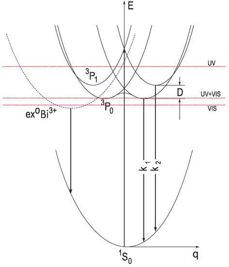 For the systems of this type, a new RES model was proposed by Hizhnyakov [136], and the RES theory was developed in [135,137]. In this theory, the interaction of impurity optical electrons with non-totally symmetric vibrations is considered to be dominant in the relaxed excited state, while the spin-orbit, hyperfine, and other interactions are taken as small perturbations. As a result, the Jahn-Teller minima of different symmetries can be formed on the adiabatic potential energy surface of the singlet (1P) and triplet (3P) excited states. Due to the spin-orbit interaction, each Jahn-Teller minimum of the triplet RES is split into the upper emitting level and the lower metastable level, corresponding to the 3P1 and 3P0 levels of a free Bi3+ ion, respectively (Figure 7, solid lines). The applicability of this model was confirmed by the systematic experimental study of luminescence characteristics of ns2-ion-doped alkali halide crystals by the methods of time-resolved polarization spectroscopy in a wide temperature range, down to 0.4 K (see, e.g., [132,138]). It was also shown that in the Tl+, Pb2+, Bi3+ centers with a strong spin-orbit interaction, each metastable minimum of the triplet RES may not lie exactly under the corresponding emitting minimum, like in the Ga+, In+, Ge2+, Sn2+ centers with a weak spin-orbit interaction. Instead, it can be shifted towards smaller coordinate q values with respect to the emitting minimum (Figure 7). Due to that, the energy barriers for the thermally stimulated transitions between the metastable minima of various orientations can be much smaller than those between various emitting minima (see, e.g., [85,132,139] and references therein).