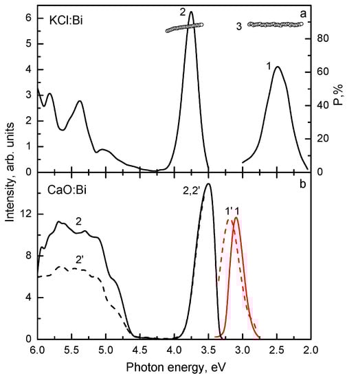 Emission (curves 1,1’), excitation (curves 2,2’), and polarization (curve 3) spectra of (a) KCl:Bi and (b) CaO:Bi at 4.2 K. In (a), Eexc=3.7 eV (curves 1,3) and Eem=2.6 eV (curves 2,3). In (b), Eexc = 3.5 eV, slow component (curve 1), Eexc = 3.6 eV, fast component (curve 1’), Eem = 3.1 eV (curve 2), and Eem = 3.3 eV (curve 2’). Based on the data reported in [85]. Presented with the publisher’s permission.