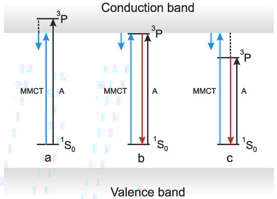 According to [7], the UV emission appears when the 3P1 level of Bi3+ is located below CB. In this case, the energy of the MMCT should always be higher as compared with the energy of the 1S0 → 3P1 transition (Figure 11). However, in most of the investigated cases, the excitation band of the VIS emission is slightly shifted to lower energies as compared to that of the UV emission (see, e.g., [14,15,19,24,64,78,93,94,95,96,104,109,110,119,121,140,141] and Figure 2b,c).
