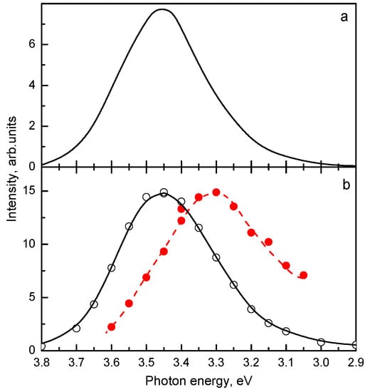 - Nagli, L.E.; Dyachenko, S.V. Influence of a vc− Vacancy on Luminescence of Pb+ Centres in Alkali Halides. Phys. Stat. Sol. B 1988, 146, 295–301. [Google Scholar] [CrossRef]
