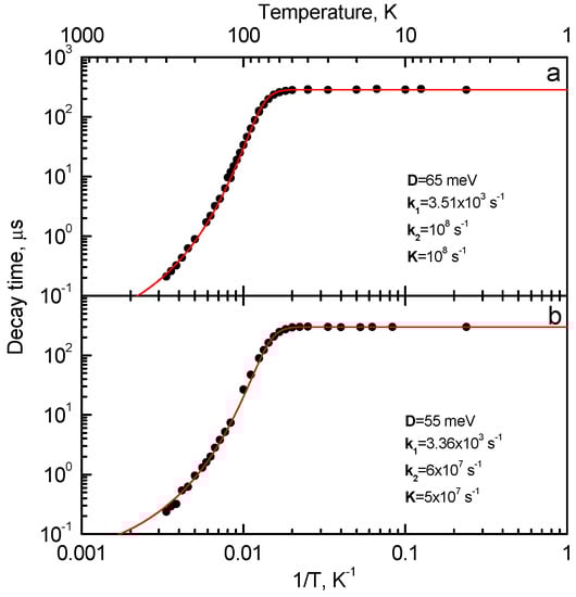 At 4.2 K, the slow component with the decay time τSC ≈ 1.1 ms is observed in the decay kinetics of the UV emission of Y3Al5O12:Bi (Figure 4a). The decay time remains constant up to 100 K and then decreases (Figure 5). This dependence is characteristic for the radiative transitions from a triplet RES where the lowest-energy (metastable) level has much smaller radiative decay probability as compared to the upper (emitting) level (see also [3,68,80]). Indeed, at T < 100 K, the slow decay component is associated with transitions from the metastable level. As the temperature increases, the decay time shortens exponentially due to thermally stimulated transitions between the metastable and emitting levels and reaches a constant value at the temperatures (around 350 K), where the system achieves thermal equilibrium. At higher temperatures, the decay time decreases due to the luminescence thermal quenching. Analogous τSC(T) dependences were obtained, e.g., for the triplet emission of Pb2+ centers in alkali halides [131] and Bi3+ centers in CaO [85], alkaline-earth sulfides [87], and alkaline-earth fluorides [92].