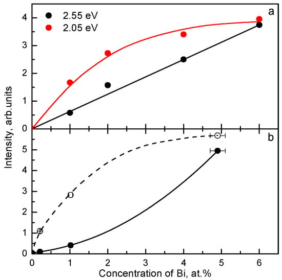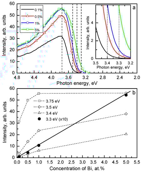 Luminescence characteristics of different Bi3+-doped materials were connected in the literature with the single Bi3+ ions and with dimer {Bi3+ - Bi3+} centers or Bi3+ clusters. The UV emission was usually concluded to arise from the electronic transitions from the excited levels of a single Bi3+ ion to its ground state, corresponding to the 3P1,0 → 1S0 transitions of a free Bi3+ ion. The VIS emission was ascribed in the literature to the same 3P1,0 → 1S0 transitions; to Bi3+ pairs or clusters of Bi3+ ions; to charge-transfer (CT) transitions (in particular, to metal-to-metal charge transfer—MMCT, the Bi3+ → Bi3+ charge transfer inside a {Bi3+ - Bi3+} dimer called the intervalence charge transfer—IVCT, and O− → Bi3+ charge transfer); to radiative decay of impurity-trapped exciton; to D-state emission; to radiative decay of an exciton localized around a Bi3+-related center (e.g., a Bi3+ ion, dimer {Bi3+ - Bi3+} center, {Bi3+ - defect} center).