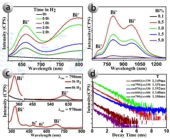 In addition to rich literature dealing with the Bi3+-based luminescence in many kinds of crystalline solids mentioned above, there is an increasing interest in the study of bismuth centers with the valence lower than 3+ for their specific emission characteristics given by radiative transitions within the 6p shell. Namely, the Bi2+ center was ascribed to red luminescence in SrB4O7 host in 1994 [105] and other examples can be found in the review paper of Sun et al. in 2014 [8]. More recently, several studies appeared ascribing the near infrared luminescence to Bi0 center, e.g., in Ba2P2O7 host [106]. Even the Bi+ center was ascribed to new luminescence bands in the visible-near infrared spectral region in Ba2B5O9Cl:Bi. These new bands appear among those associated with the Bi2+ and Bi0 centers during the annealing cycles in air and the reduction atmosphere [107].