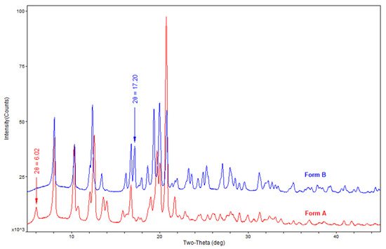 Powder X-ray diffraction (PXRD) patterns of sofosbuvir of form A and form B.