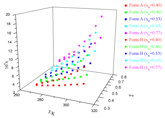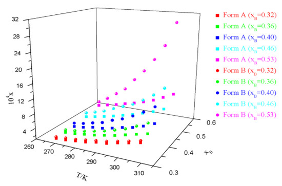 Experimental data on solubility measurement are presented in Tables S2−S5, Supplementary Information, and graphically illustrated in Figure 3; Figure 4. It is obvious that the solubility of sofosbuvir increases with the temperature and the mole fraction of ethyl acetate or MTBE. Solubility of form B is higher than that of form A under all of the experimental conditions, which means that form A is more stable than form B at the temperature range of measurement. The relative thermodynamic stability is in line with our previous research [3].