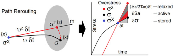 Initially, the particle resides in position and stress is. Shortly later, the particle is forced to change its trajectory and arrives at position, where stress is. Should the original path be available, the particle would move to position with velocity and the stress would be. In all the scenarios, equations of motion must be preserved. The particle acceleration and mass density are denoted by and. The rerouting alters tractions projected onto the surface that is normal to the direction of the particle velocity. The difference in tractions between positions and triggers stress perturbations. The perturbations are stretched over distance. Next, the volume is reduced to a material point and stress perturbations become, where is the momentum tensor. The path rearrangements affect particle acceleration, while the overstress is partly stored in dislocation structures (Figure 1). The uncompensated stress in Figure 1 activates dynamic excitations. Given sufficient time, the overstress is fully relaxed.