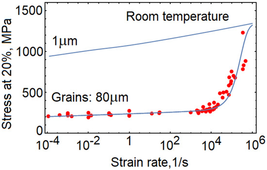 The initial resistance to plastic flow is a consequence of pre-existing defects. At dynamic conditions, the excess of energy further amplifies the resistance. Consistently with the description of thermal resistance (Section 3), the relation is constructed on the basis of the weakest link hypothesis. The constants and specify dynamic constraints. The process occurs along the lowest energy pathways, while the frequency of the rerouting events is controlled by the exponent. The dynamic resistance to plastic flow is responsible for the stress upturn (Figure 3). It is shown that the upturn becomes much less pronounced in metals composed of fine grains, where the initial value of is closer to one. A full justification of the result is provided in Section 7 (Equation (13)). In Figure 3, the data points marked in red are collected from multiple sources [5,36,37,38,39,40,41,42,43,44]. Experiments performed on fine-grained tantalum [14] and copper [15] confirm the predictions constructed for microcrystalline copper.