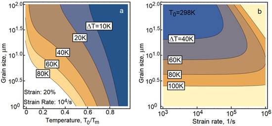 The relation is further simplified, where equivalent plastic strain has already been defined and is yield stress. The Taylor–Quinney coefficient becomes. The heat sources are formed discretely both in time and space, where spatial resolution of the sources is estimated to be in a sub-micrometer range. Experimental techniques are yet to be developed for the measurement of such small-scale temperature fluctuations. Large-scale atomistic simulations might provide invaluable insight into the phenomena. It should be stated that the contours in Figure 4a,b are constructed under the assumption that the copper specimen is subjected to uniaxial compression and the temperature rise is depicted at strain 20%. The coefficient is calibrated using experimental data presented in [46]. In Figure 4a, the temperature rise is calculated as a function of grain size and initial temperature . The samples are deformed at a strain rate of. The contours indicate that plasticity-induced heating is significantly stronger in microcrystalline copper. The environment affects the rate of heating. In large-grain copper, high strain rates noticeably magnify plasticity-induced heating, while small grains make the strain rate sensitivity an irrelevant factor (see Equation (13) and Figure 4b). For example, at a strain rate of the same temperature rise is predicted in copper with average grains 2.5 μm and 77 μm. It would be very interesting and, perhaps, technologically important to experimentally validate the theoretical predictions. The grain size dependence is discussed in the next section.