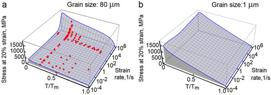 The red points depict experimental data collected from several sources [5,35,36,37,38,39,40,41,42,43,60,61,62] and the blue mesh represents the model predictions. The model correctly predicts copper responses (grains 80 μm) at temperatures from cryogenic environments up to melting points and strain rates from quasi-static loading to extreme strain rates. The second plot in Figure 6b is constructed for microcrystalline copper, where the grain size is 1 μm. Note that in the second case the stress upturn is nearly gone. This result matches experimental measurements performed on small-grained tantalum [14] and copper [15]. The strain rate sensitivity was also studied in nickel [63], where ultrafine-grained nickel exhibits a diminishing rate-sensitivity.