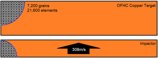 The constitutive model is implemented to a code of deformable discrete element method (DDEM). In DDEM, each discrete element represents a crystallographic grain. The grains experience large deformation and are subjected to translation and rotation, where the rigid motions are directly measurable quantities. A more detailed description of the method is presented in Appendix A. In the DDEM construction shown in Figure 8, the Cu flyer is discretized with the use of 7200 elements, while the Cu target is composed of 14,400 elements. The thicknesses of the flyer and target are 1.9 mm and 3.9 mm, respectively. The flyer travels with velocity 308 m/s and, after striking the target, shock waves are sent into both of the samples.