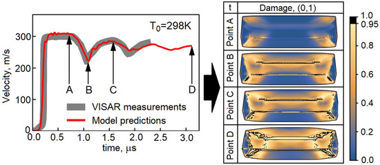 VISAR measurement (thick gray line) reported in [64] is compared with results of the numerical simulation (red line). Damage levels from zero (no damage) to one (fully developed crack) are shown at VISAR points A, B, C and D. The contours are rescaled to fit the window.