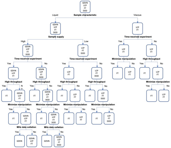 An example of a sample delivery method decision tree. Some major experimental considerations are used here to illustrate options for sample delivery, but likely not including criteria specific to individual sample and experimental requirement. Decisions are suggested based on current knowledge and may not reflect on future development trend. GDVN, gas dynamic virtual nozzle jet; LCP, lipidic cubic phase jet; FT, fixed target support; and DOD, drop-on-demand.