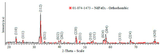 - Zharvan, V.; Kamaruddin, Y.N.; Samnur, S.; Sujiono, E.H. The effect of molar ratio on crystal structure and morphology of Nd1+xFeO3 (x = 0.1, 0.2 and 0.3) oxide alloy material synthesized by solid state reaction method. In Proceedings of the 4th International Conference on Advanced Materials Science and Technology, IOP Conf. Series: Materials Science and Engineerieng, Universitas Negeri Malang, Malang, Indonesia, 27–28 September 2017; Volume 202, p. 012072. [Google Scholar]