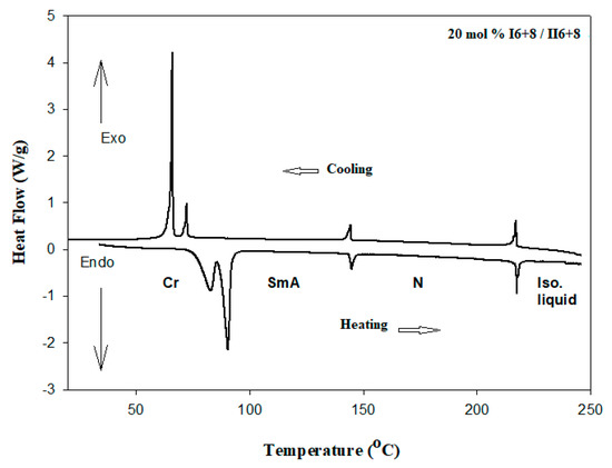 Figure 1 shows the DSC heating curve of 20 mol % I6+8/II6+8 as an example. As for pure I6 and I8, the binary mixtures exhibited different endothermic peaks, crystalline (Cr)–smectic A (SmA) or smectic C (SmC)–nematic (N)–isotropic (I), Representative POM textures are depicted in Figure 2. Transition temperatures and their corresponding enthalpy of transitions for three homologues binary mixture systems (n = 6 and m= 8, 10 and 12 carbons) are tabulated in Table 1. Individual compounds were previously reported in our investigations [40,41]. The thermal transitions of the pure compounds, as well as their mixtures, are graphically illustrated in Figure 3a–c. As can be seen from the Table 1 and Figure 1, both homologues bearing similar alkoxy chain length upon mixing showed to be enantiotropic dimorphic, covering all compositions accompanied by a decrease in the melting temperatures compared with their components.