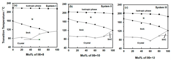 Similarly, the binary system of the higher chain length system III (I6+12/II6+12), Figure 3c, exhibited dimorphic mesophases. The concentrations of the mixture from 10% to 80% of II6+12 possessed SmA and N, but a binary mixture with a higher concentration of II6+12 (>80%) possessed SmC and N. As can be seen from Figure 3c, both the TSm-I and TN-I decreased gradually with increased content of the II6+12. Further, the eutectic mixture was observed around 60 mol % of II6+12.
