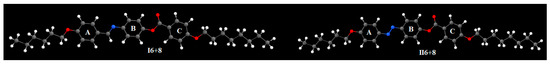 The charge distribution map for the Schiff base/ester I6+8 and the azo ester II6+8 was calculated under the same basis sets according to molecular electrostatic potential (MEP) (Figure 5). The red region (negatively charged atomic sites) was distributed on the aromatic moiety and the maximum was carbonyl oxygen of the H-bonded carboxylic group, while alkoxy chains showed the least negatively charged atomic sites (blue regions). As shown in Figure 5, there was no significant effect of the mesogenic core on the mapping of the charge distribution. Thus, we can conclude that an excellent choice of compounds for mixtures to modify the mesomorphic behavior. Moreover, the similar charge distribution explains the enhancement of the mesophase stability and the mesophase range of the mixture at the eutectic ratios. Recently, we also reported [33,47,52,54,56,61] that mesophase temperature range is highly affected by competitive interactions between end-to-end and side-to-side interactions by increasing chain length, and that these factors are highly impacted by the map of the charge distribution.