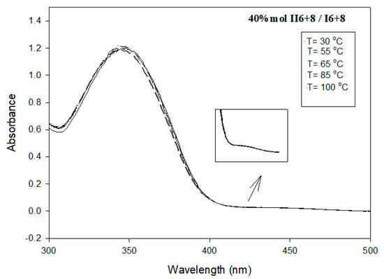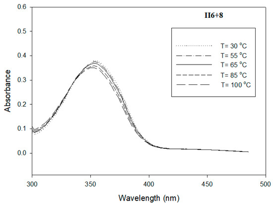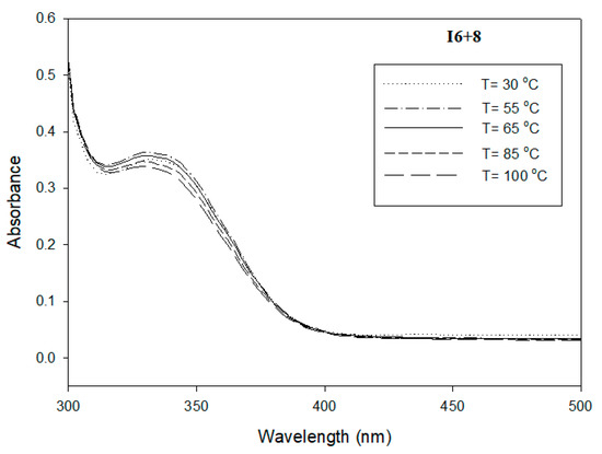 UV absorption spectrum of binary eutectic mixture of II6+8/I6+8 in DMF (C = 1.8 × 10−6 mol/L) at temperature range 298–398 K.