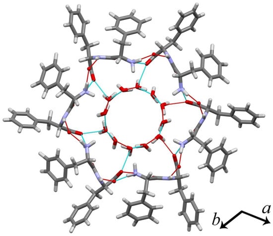 Structure of D-diphenylalanine dipeptide (H-D–Phe–D–Phe-OH, FF) microtube: in grey—carbon, in white—hydrogen, in red—oxygen, in violet—nitrogen. The cyan lines are hydrogen bonds between the atoms in the molecules belonging one cell. The red lines denote hydrogen bonds with atoms from neighbouring cells. C axis is perpendicular to the plane of the figure.