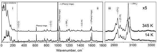 Figure 3 represents the full Raman spectra at 14 and 345 K. The spectrum can be subdivided into three distinct regions, corresponding to the vibrations of constituting structural elements: (i) 10–280 cm that is due to lattice vibrations, (ii) 280–1800 cm vibrations of molecules’ functional groups: lines at 1002 and 1032 cm due to phenyl rings vibration, (iii) 2800–3350 cm is a region of C−H, and N−H vibrational modes (Figure 3).
